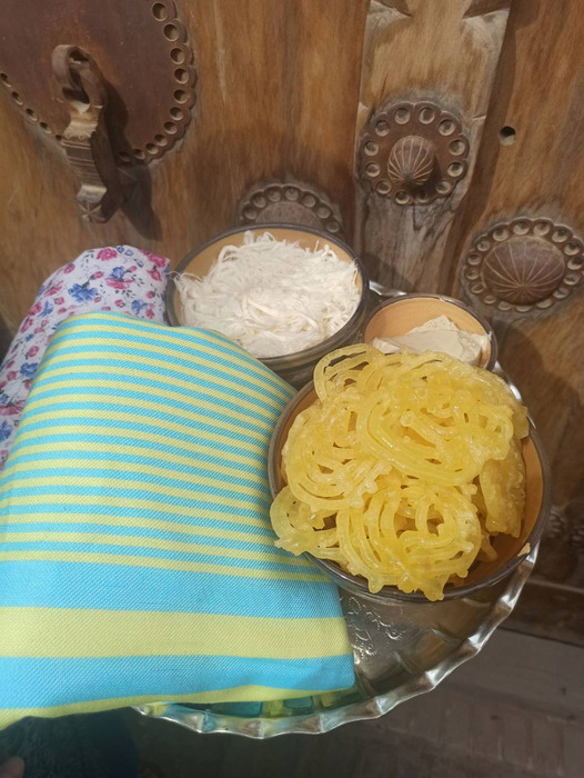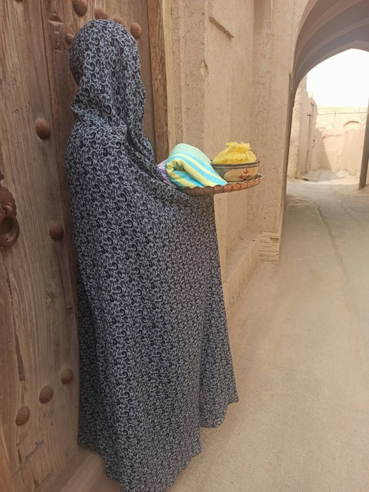 في هذا التقليد، يقدم أهل العريس هدية للعروس، عادةً تتضمن الحلويات وقطعة قماش تُستخدم لخياطة الشادرك أو الملابس. أكثر الحلويات شيوعًا هي الزولبيا، إحدى الحلويات التقليدية في يزد، ولكن أحيانًا تُستبدل بحلويات أخرى مثل الحلوى، الحاجي بادامي، البشمك، أو الكلكند. وقد تُجمع عدة أنواع من الحلويات معًا، لكن يجب أن تتضمن الهدية نوعًا أو أكثر من الحلويات.